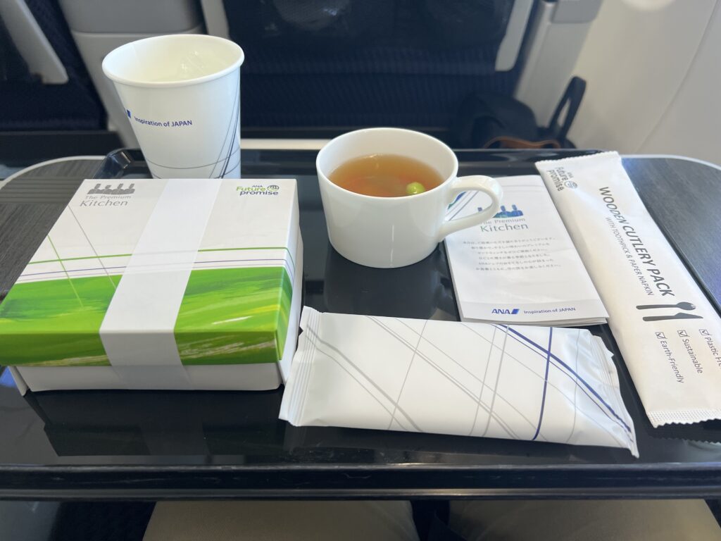 しかし、ANAプレミアムクラスでは、スープと軽食がセットになったプレートをお配りいただきます。ドリンクについてもソフトドリンクはもちろん、アルコールに至るまで準備されています。
