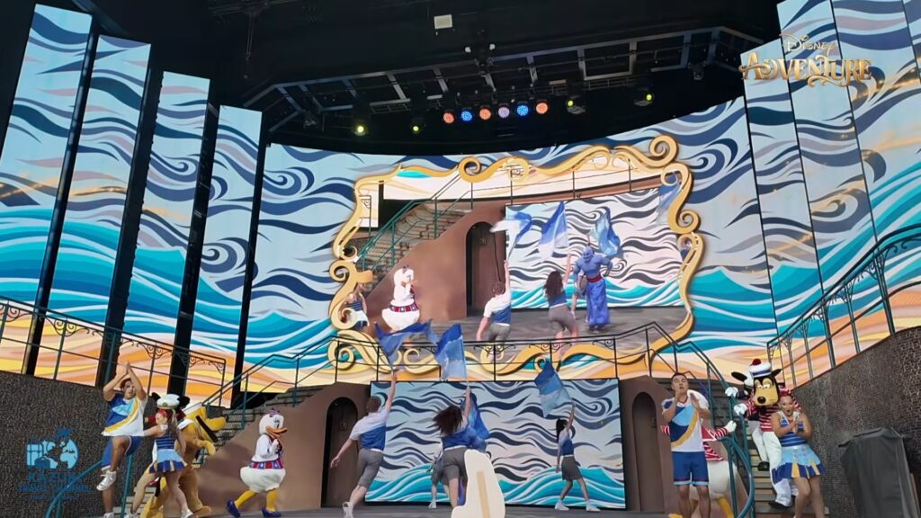 「Let’s Set Sail」は、Disney Adventure号の出航を盛り上げるディズニークルーズライン定番の出航セレモニーパーティーです。キャプテン・ミッキーマウスとキャプテン・ミニーマウスをはじめ、アドベンチャー号ならではの特別なキャラクターたちが続々と登場。ハイエナジーな音楽に合わせて、笑い・踊り・歓声が溢れる、まさに「魔法の船出」を体感できるひとときです。